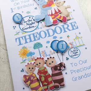 Handmade card featuring the child's name decorated with characters from In The Night Garden. Long names have smaller letters, short names have larger letters. You can personalise your card with any name, any favourite characters and have any colour theme. You can have your own choice of words printed on the front so it can be for any age birthday.