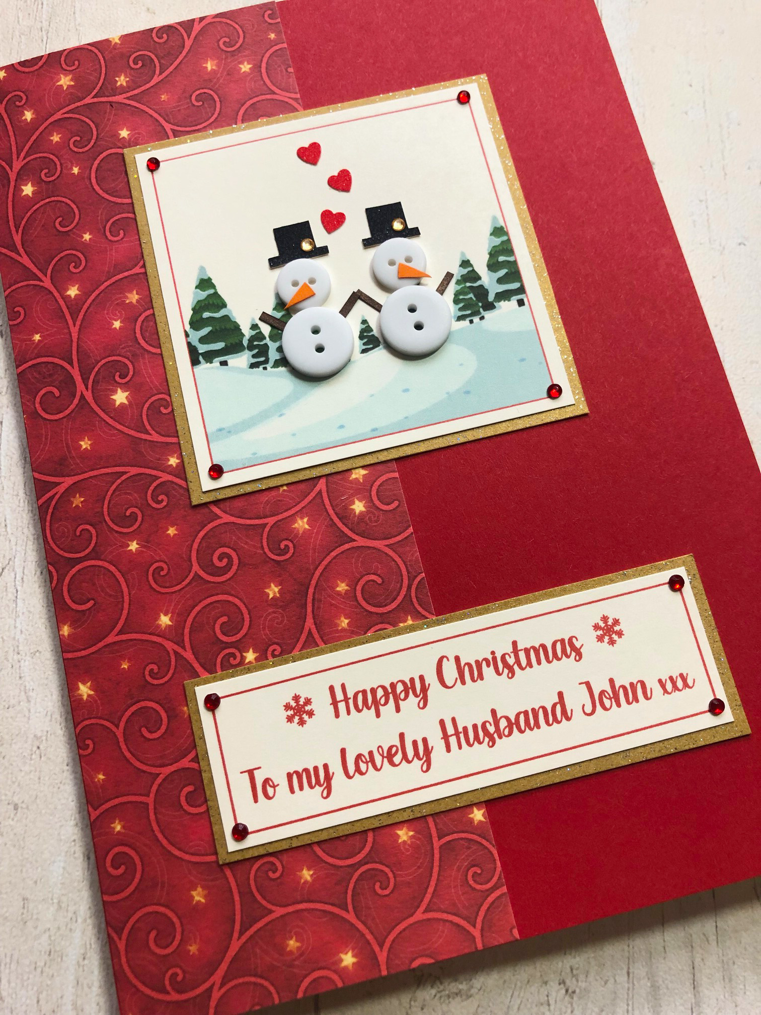 Handmade Christmas card featuring snowmen made from small buttons. Personalise with your own choice of words printed on the front. You can have between 1-4 snowmen perhaps to represent a family (all snowmen are the same size).