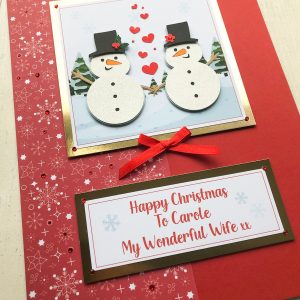 Handmade Christmas card featuring a snowman couple. Personalise with your own choice of words printed on the front. Have the background card and the backing Christmas design paper in any colour.