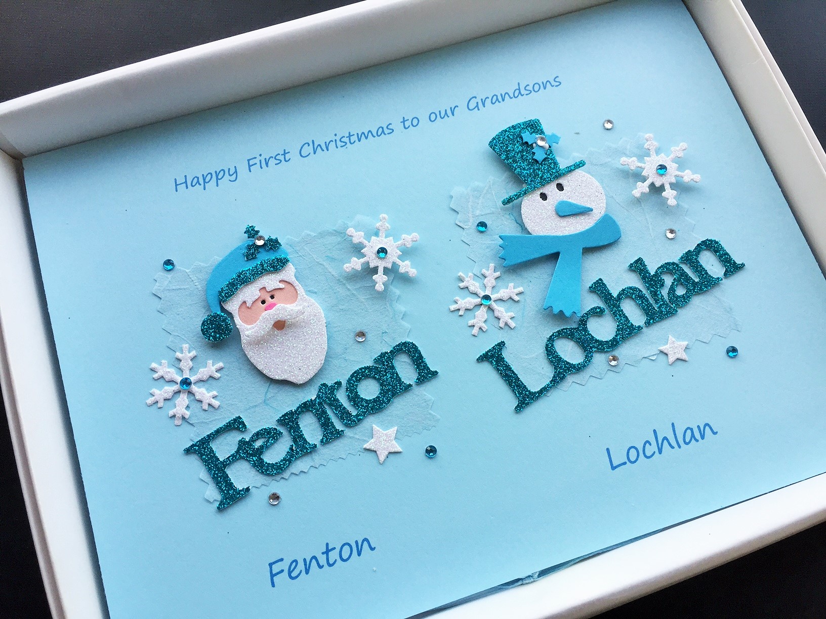 Handmade Christmas card with two patches, one for each child or this card could be made for a couple with man/woman snowmen faces. Personalise with any names, any printed wording and have this card made in any colour. the example shows a snowman and santa but you can have other christmas decorations if you prefer.