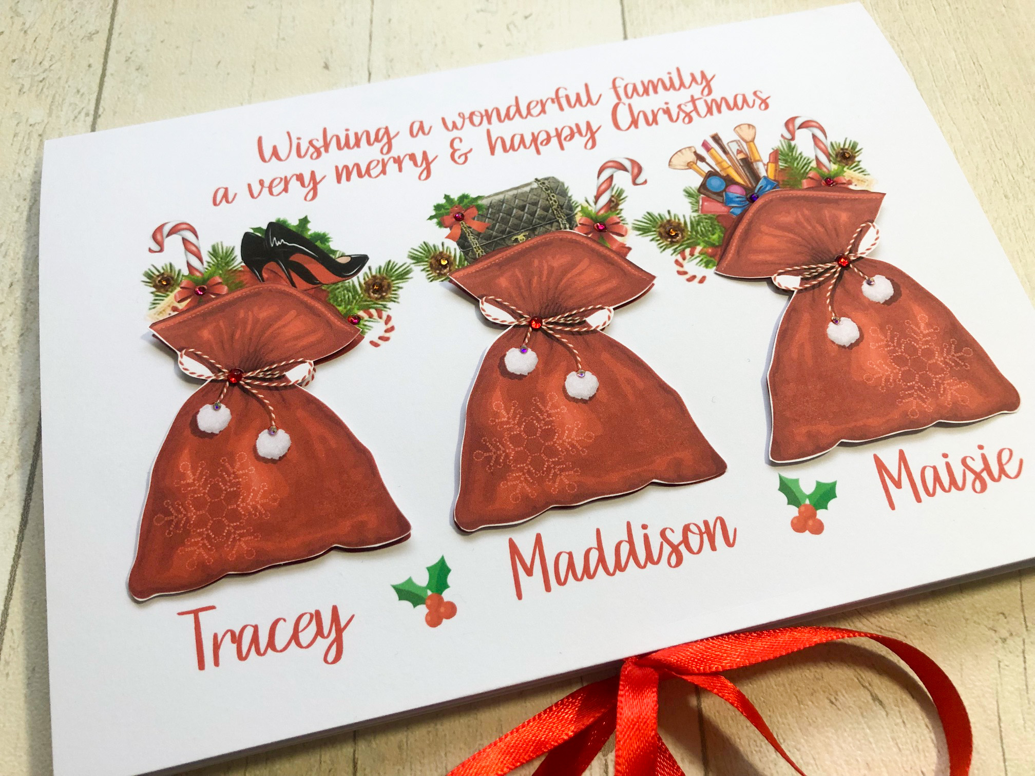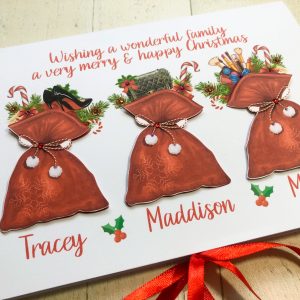 Handmade Christmas card featuring one, two or three sacks, one for each child, filled with their favourite toys or hobbies. Each sack has their initial. Personalise with any names, any printed message on the front below the sacks and have one or two personalised items inside each sack.