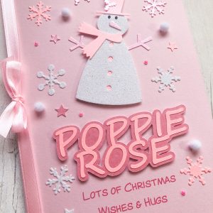 Handmade Christmas card featuring a snowman and cut out name. Personalise with any name & message.