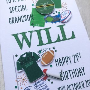 This style of customised card can be filled with embellishments that are HIGHLY PERSONALISED so your finished card suits the recipient perfectly. There is no limit to the number of items. Send a list of all their personalised hobbies. You can have any printed wording on the front, any central name and any colour theme. Have their name in 3d lettering or printed.