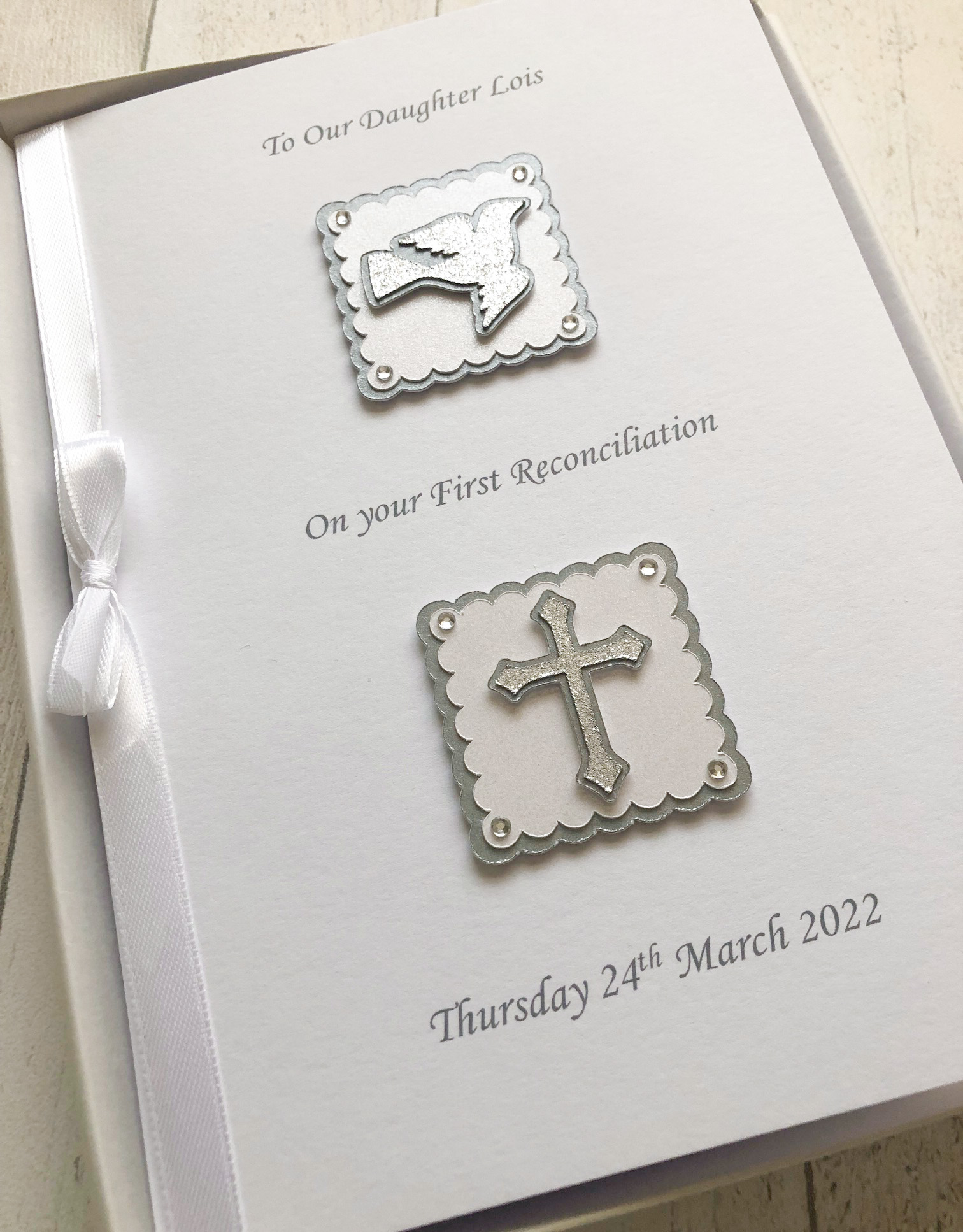 Handmade card featuring two religious embellishments perfect for the Catholic sacrament of reconciliation, or First Confession. Personalise with any name and your own choice of words printed on the front. Have this card made in any colour theme.