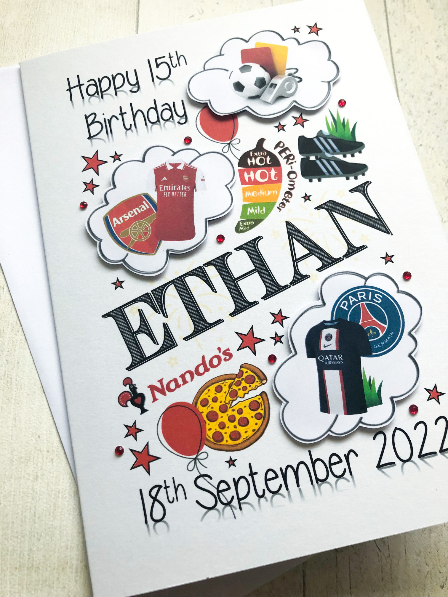 This style of customised card can be filled with embellishments that are HIGHLY PERSONALISED with incredible detail so it suits the teenager perfectly. There is no limit to the number of items. Send a list of all their personalised hobbies. You can have any printed wording on the front and any colour theme. If you run out of space in the order form boxes please send a separate email detailing your personalised wording, list of hobbies, colour choice and your deadline.