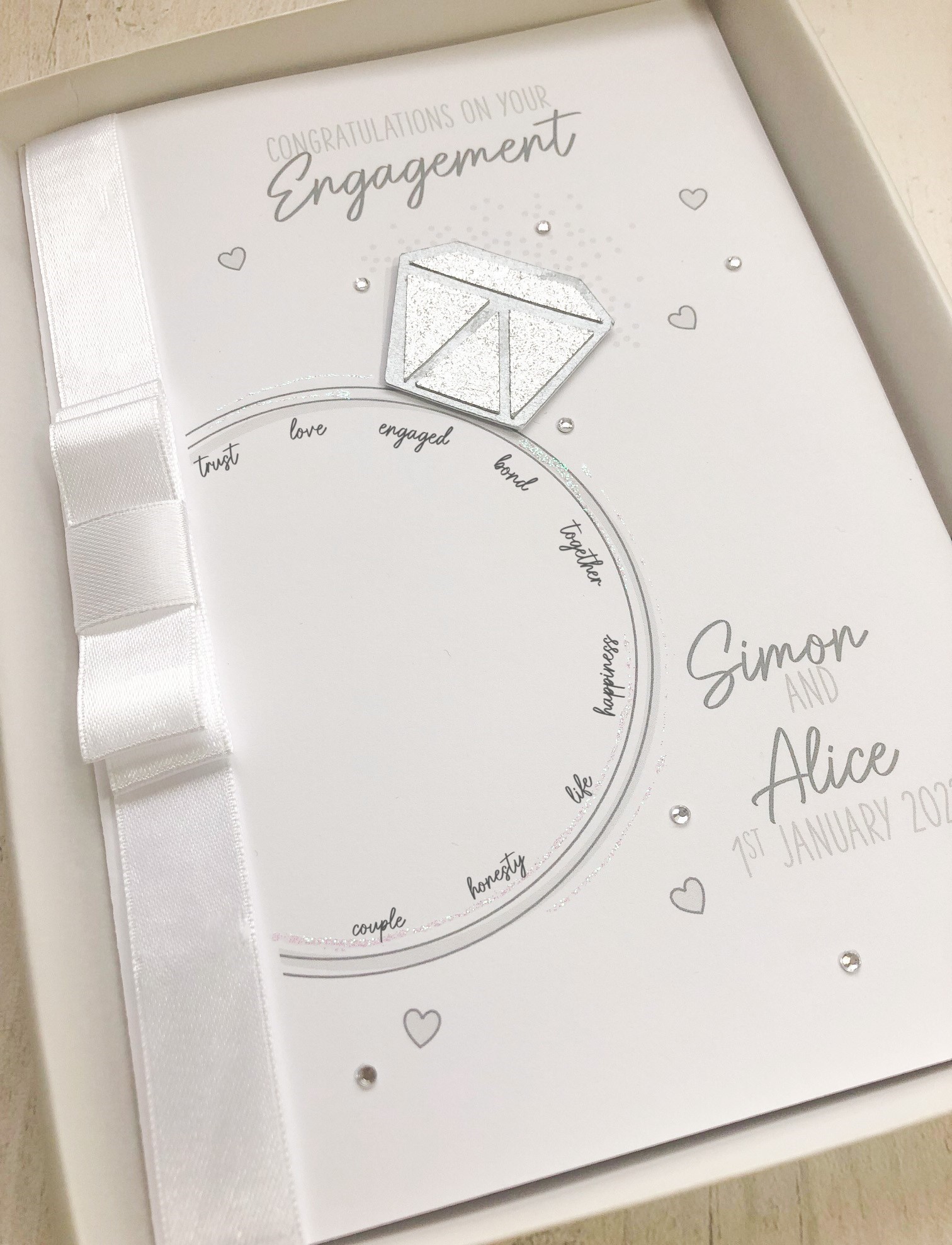 Handmade card featuring a large engagement ring. You can have any printed wording on the front, including the little words inside the ring itself.