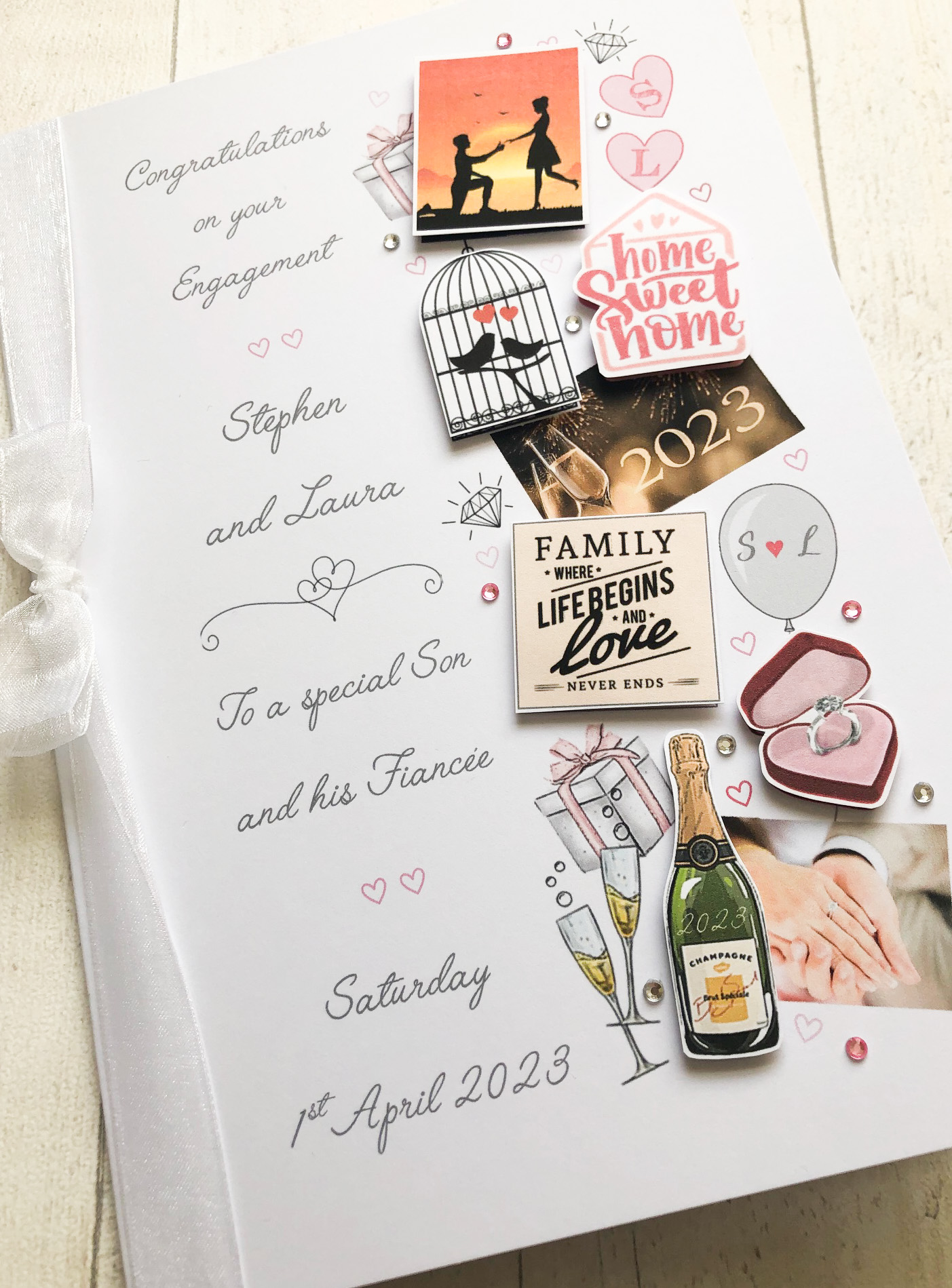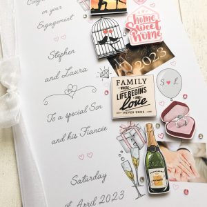 Handmade card featuring a mix of engagement images including the year they were engaged & their initials on the balloon. The embellishments are arranged vertically with the text vertical also alongside.  You can have any printed wording on the front.