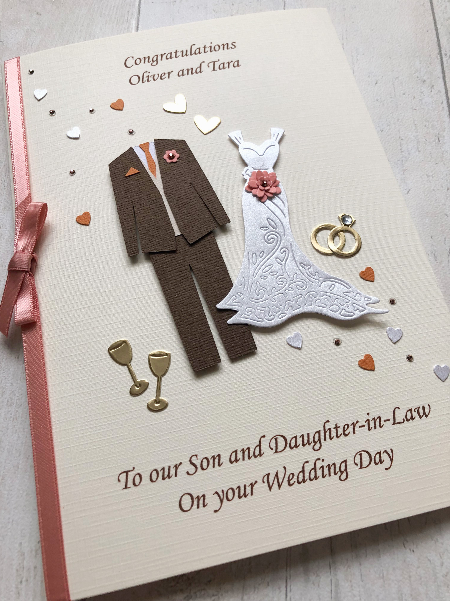 Handmade card featuring replica wedding outfits with tie, flowers and hankie in a colour to match their theme. You can have any printed wording on the front. Have the dress made as close as possible to match the style the bride is wearing in ivory, white or any other colour, and the suit can be replicated too - in any colour, two piece, three piece suit, top hat and tails, tie, cravat, no tie, shorts and open shirt for a beach wedding - the choice is yours!