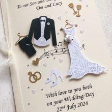 Handmade card featuring replica wedding outfits with tie, flowers and hankie in a colour to match their theme. You can have any printed wording on the front. Have the dress made as close as possible to match the style the bride is wearing in ivory, white or any other colour, and the suit can be replicated too - in any colour, two piece, three piece suit, top hat and tails, tie, cravat, no tie, shorts and open shirt for a beach wedding - the choice is yours!