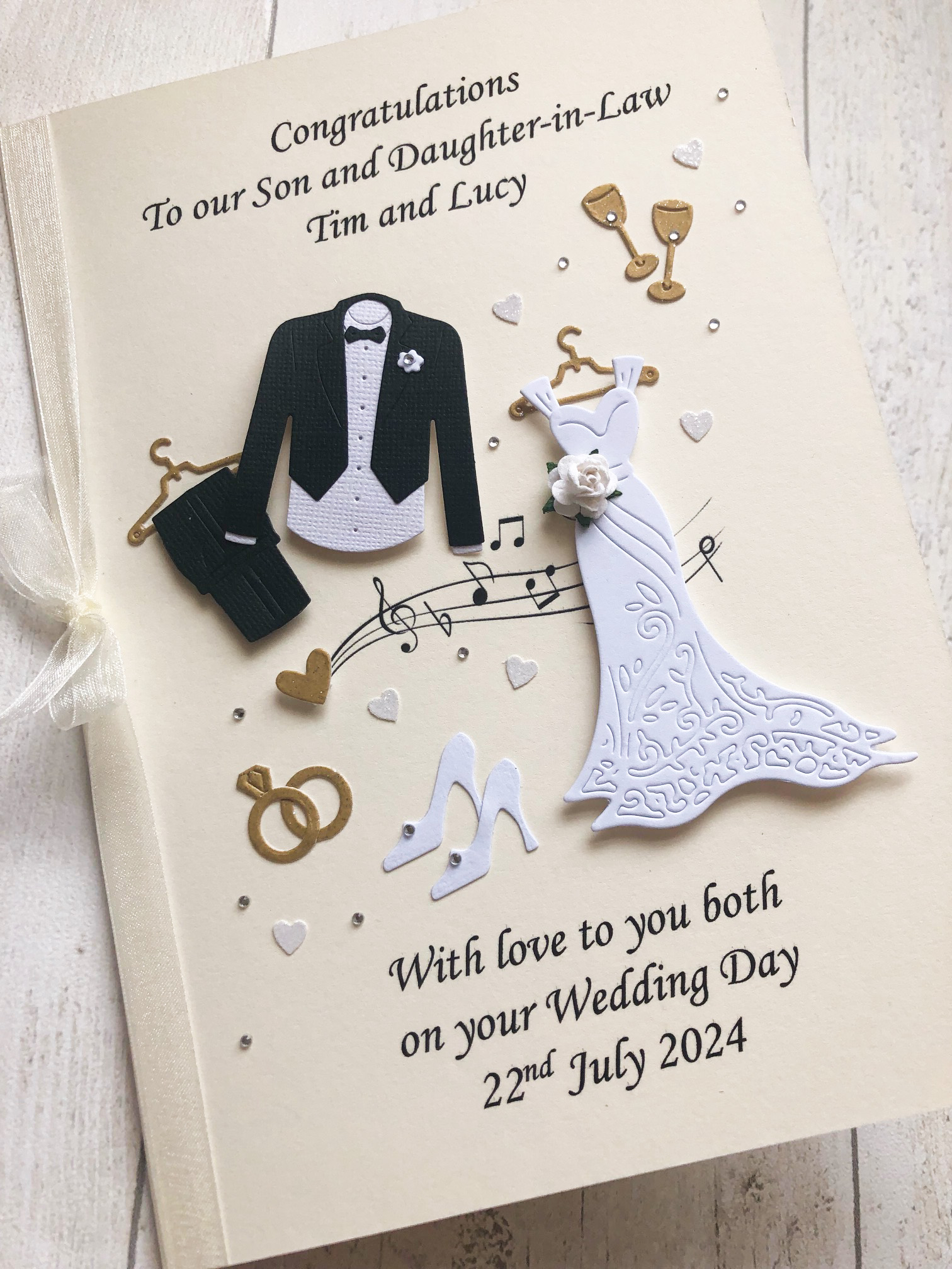 You can have any printed wording and names on the front and have the card with or without a spine ribbon.