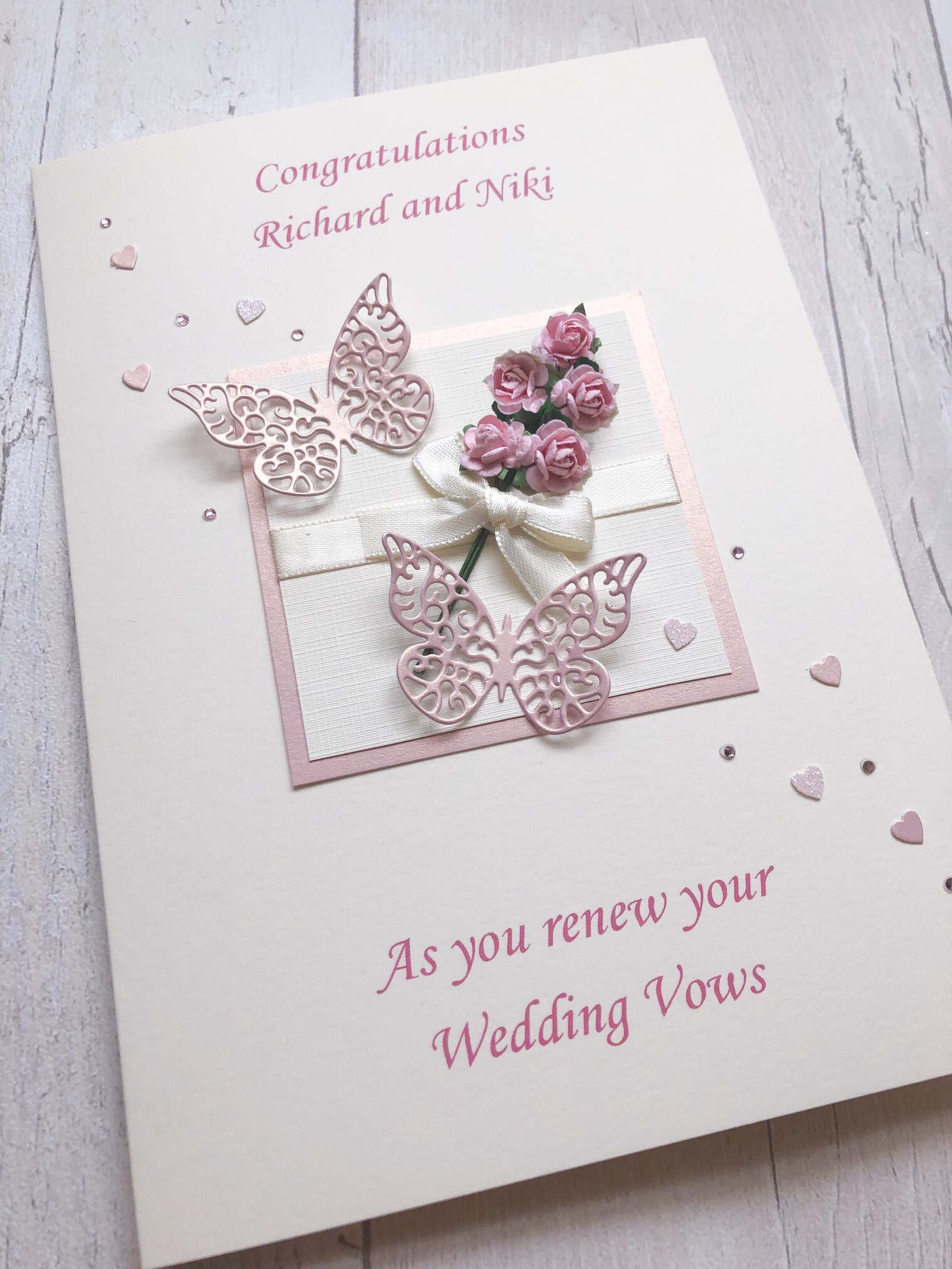 Handmade card with a flower bouquet and delicate lace butterflies.