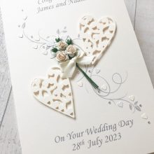 Handmade card featuring an intricate design with open roses, lace hearts, leaves and diamantes. This card can be made in any colour to match the wedding theme. You can have any printed wording on the front.
